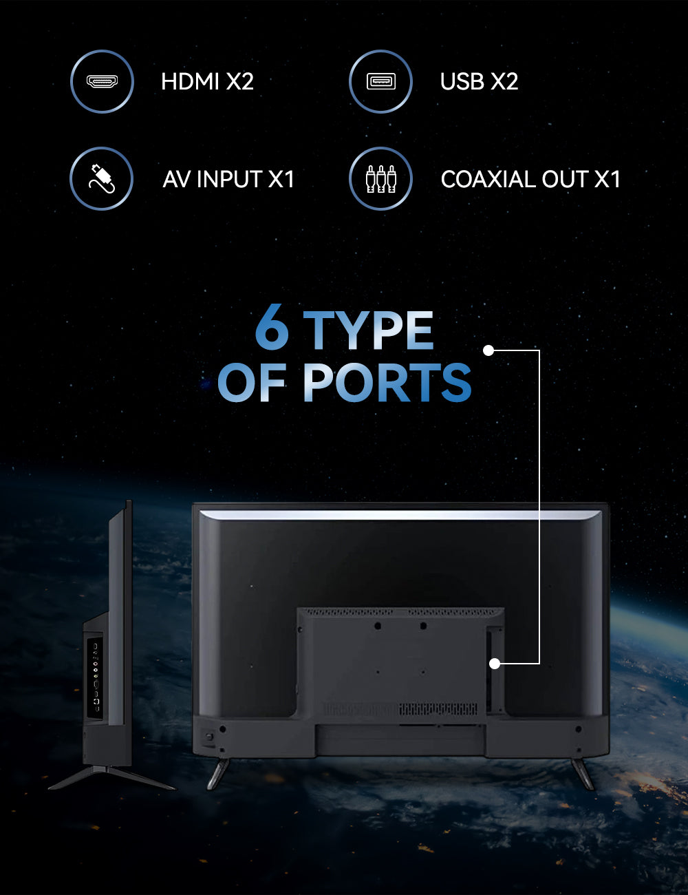 ✔ Multiple Connectivity Options: HDMI x2, USB x2, AV Input x1, Coaxial Out x1.