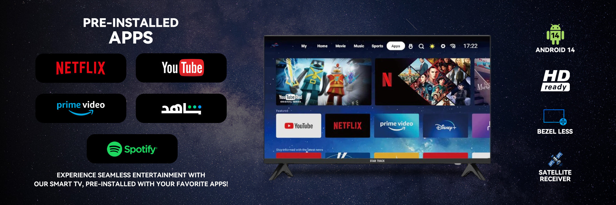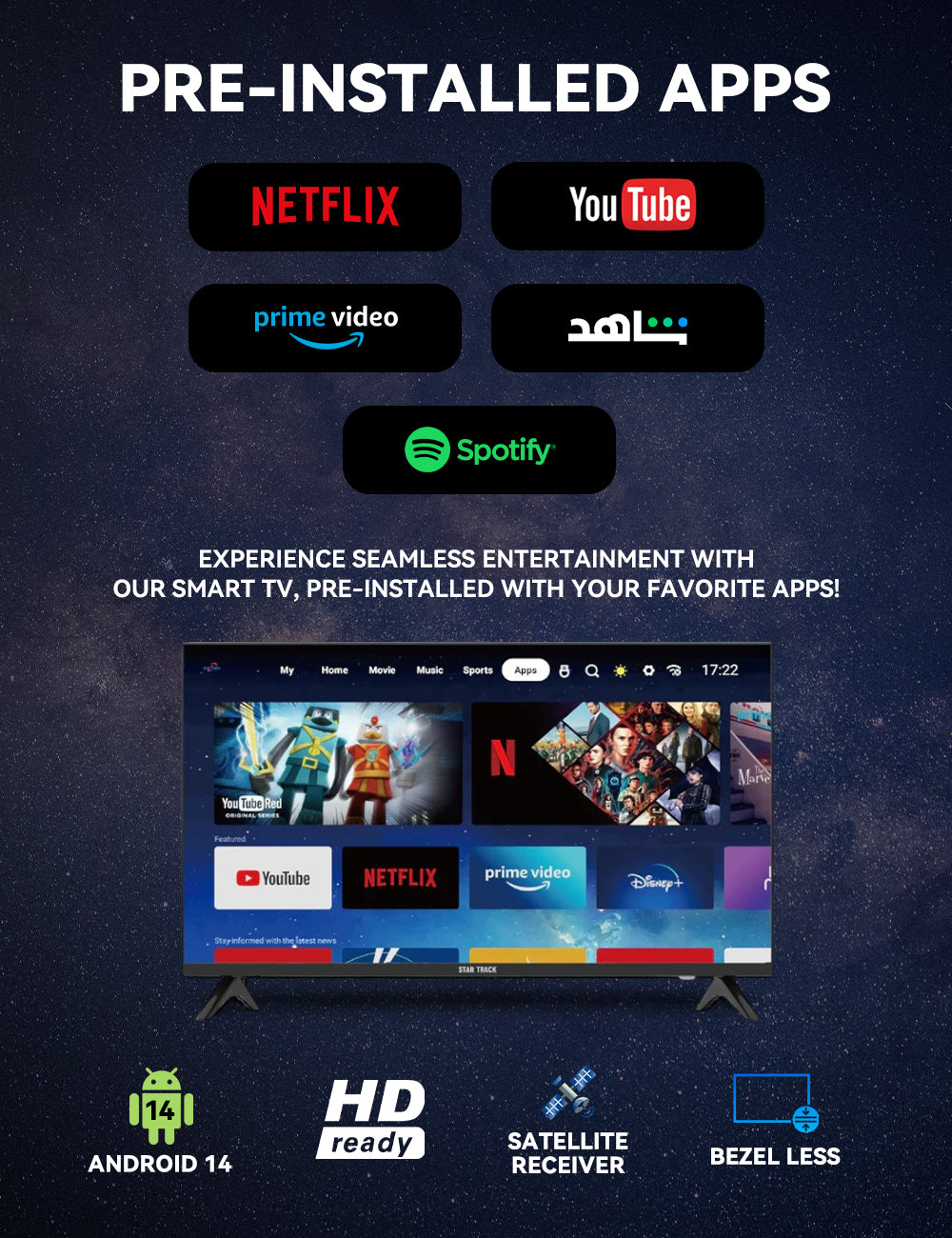 Experience seamless streaming and crystal-clear visuals with the STAR TRACK 32” Smart TV. Powered by Android 14, this ultra-slim, HD Ready TV brings your favorite apps like Netflix, YouTube, Prime Video, Shahid, and Spotify straight to your screen. With Miracast, you can effortlessly mirror your mobile device for an enhanced viewing experience.