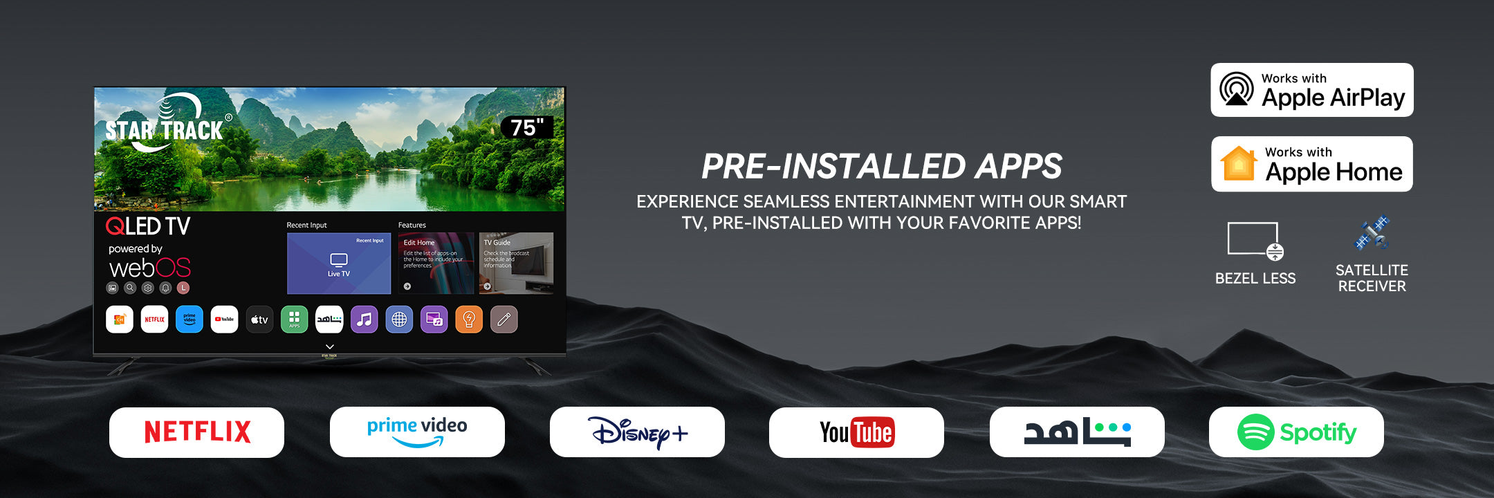 Running on WebOS, you get a smooth, intuitive interface with instant access to apps like YouTube, Netflix, Shahid, and more. The Air Mouse Remote allows fluid control with pointer navigation, while built-in Apple AirPlay & Home support gives you seamless device integration.