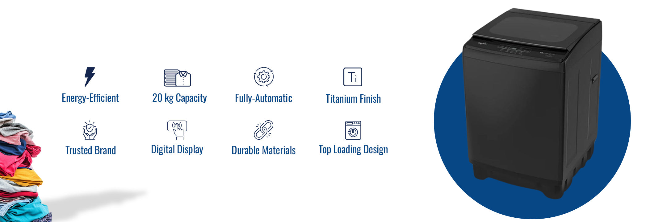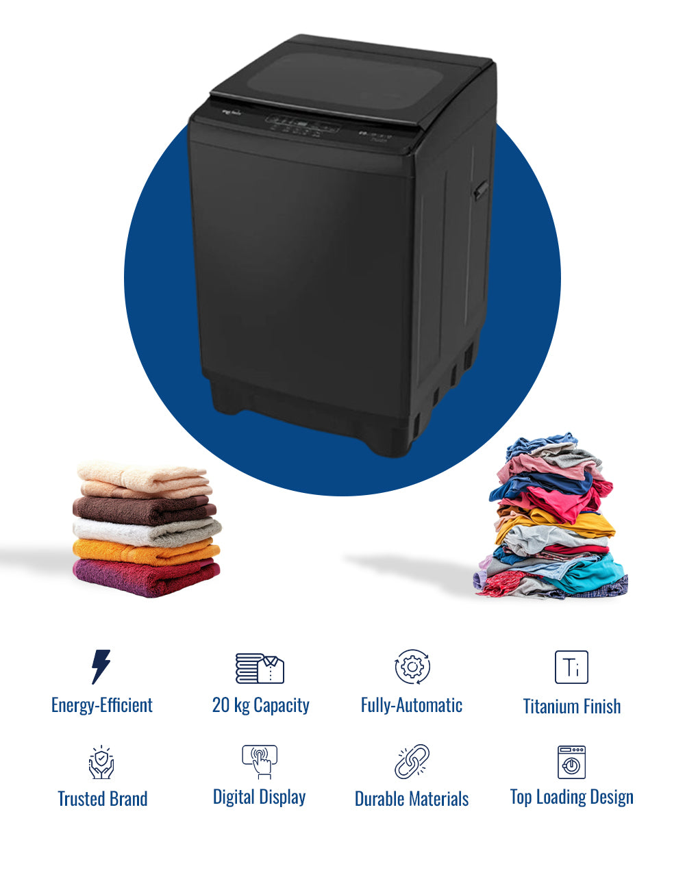 غسالة ملابس أوتوماتيكية بالكامل، تحميل علوي، سعة 20 كجم، حاصلة على تصنيف 5 نجوم من الجمعية الأوروبية للمواصفات والمقاييس، موفرة للطاقة