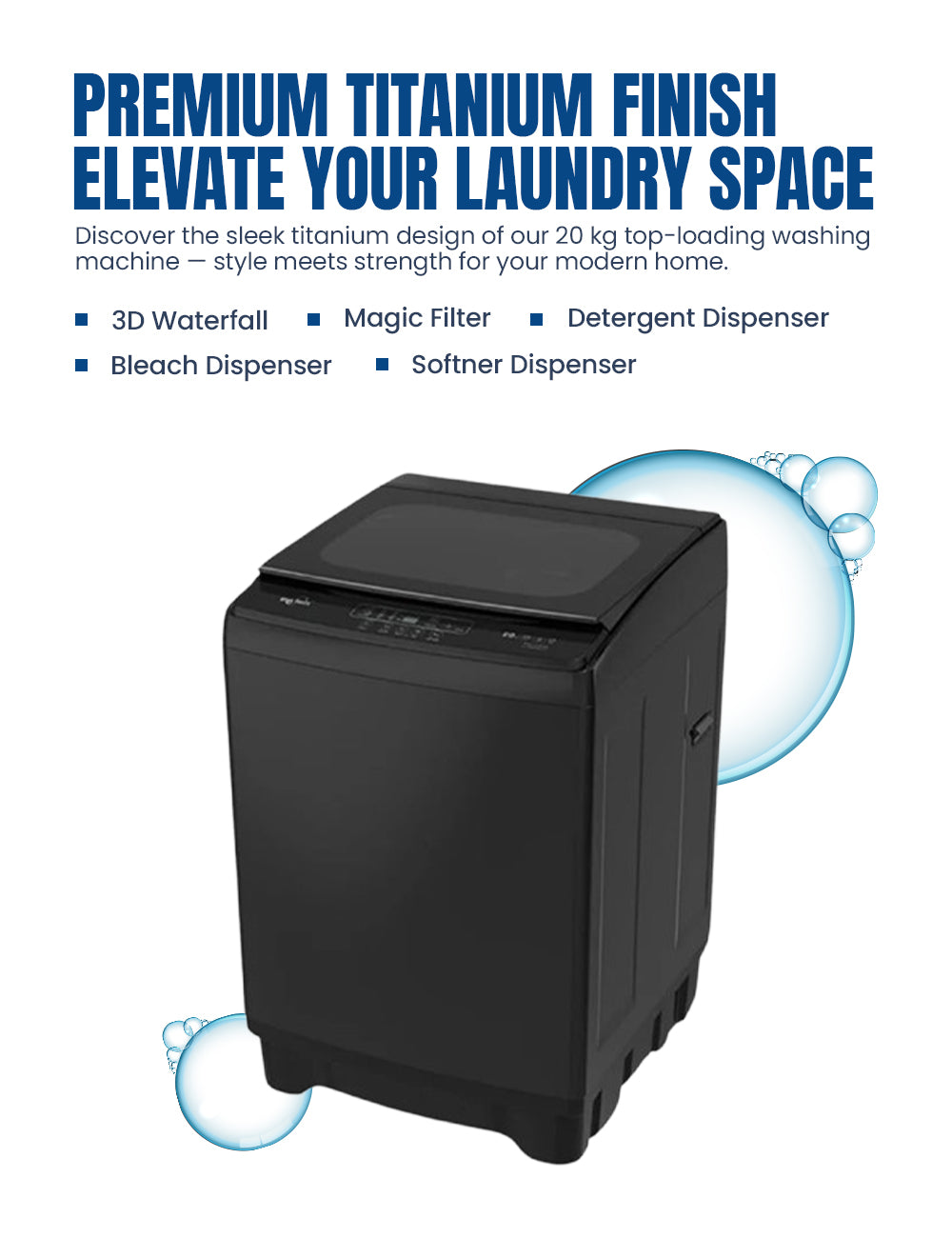 - سعة 20 كجم : مصممة للغسيل الشاق، مثالية للأسر الكبيرة أو الاستخدام التجاري.