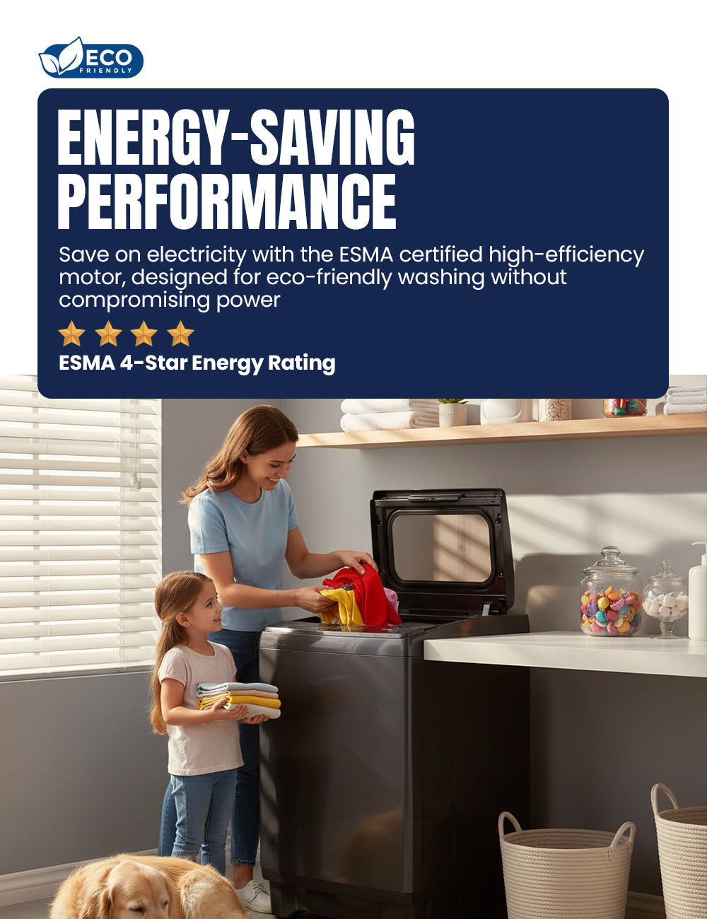 - أداء موفر للطاقة : حاصل على شهادة كفاءة الطاقة 5 نجوم من ESMA ، مما يضمن تنظيفًا قويًا مع الحد الأدنى من استهلاك الطاقة.
