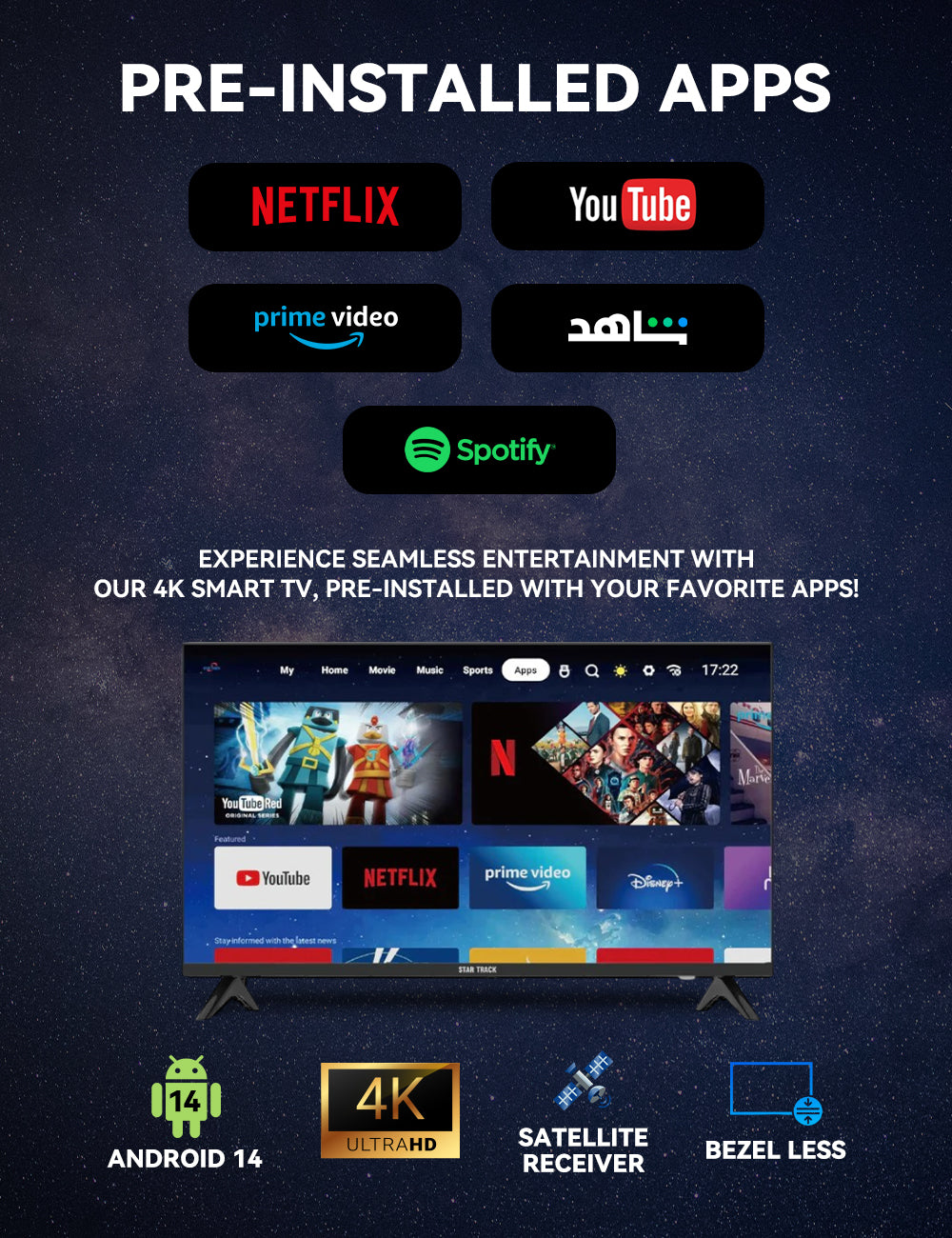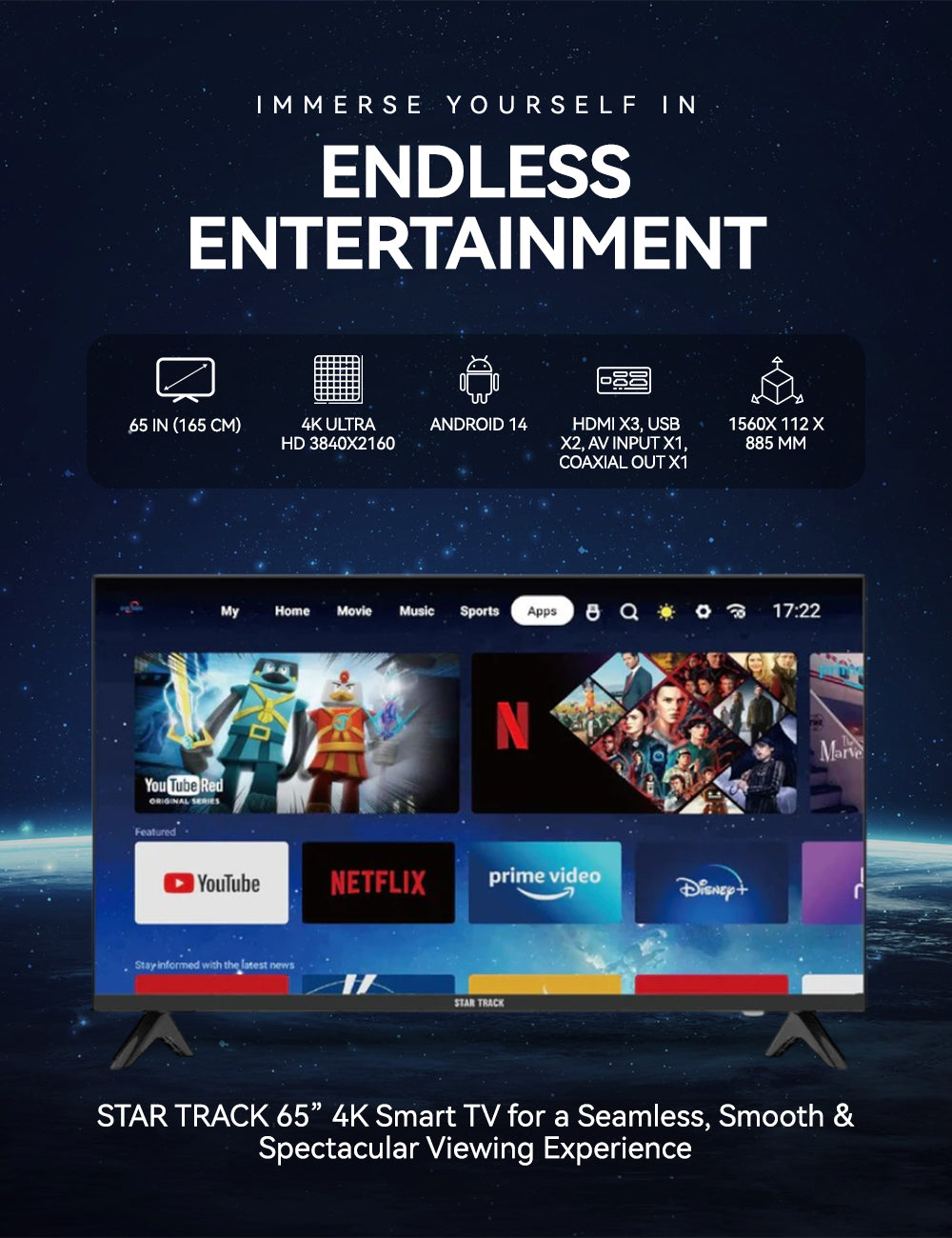 🎬 حسّن تجربة الترفيه المنزلي لديك مع تلفزيون ستار تراك الذكي بدقة 4K مقاس 65 بوصة! اطلب الآن لتجربة مشاهدة غامرة من المستوى التالي! 🚀