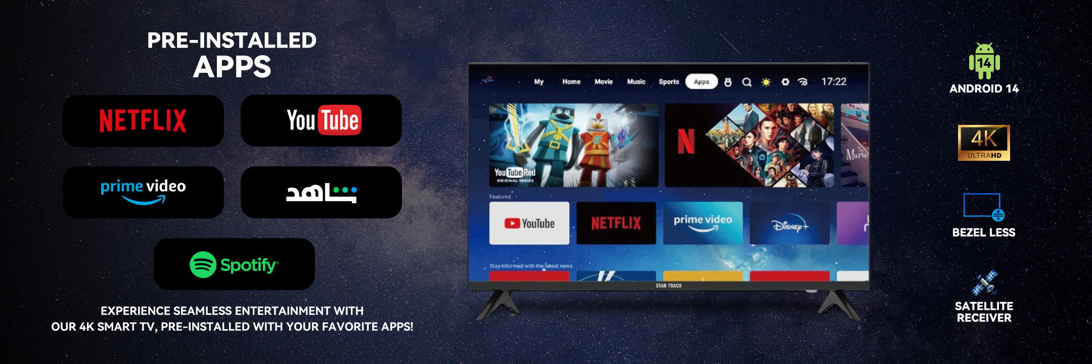 ✔ التطبيقات المثبتة مسبقًا - Netflix وYouTube وPrime Video وShahid وSpotify والمزيد.