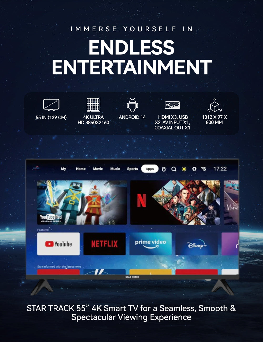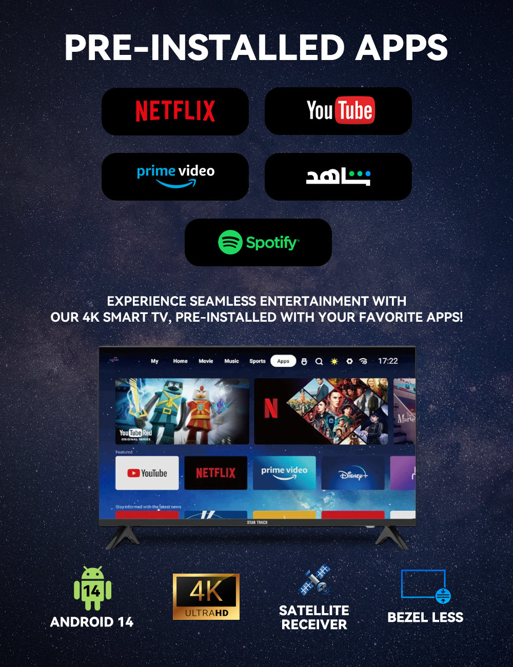🎬 حسّن تجربة الترفيه المنزلي لديك مع تلفزيون ستار تراك الذكي بدقة 4K مقاس 55 بوصة! اطلب الآن لتجربة مشاهدة غامرة من المستوى التالي! 🚀