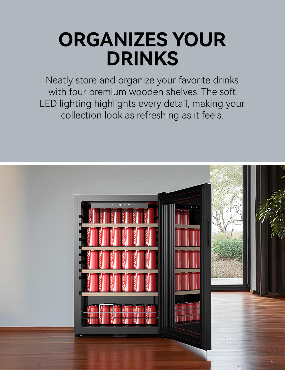 ثلاجة مشروبات سعة 115 لترًا، باب زجاجي عاكس، قفل أمان، 4 أرفف خشبية، إضاءة داخلية زرقاء - تخزين أنيق وآمن