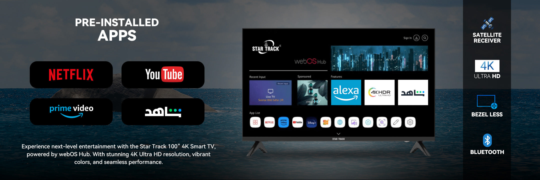 Experience next-level entertainment with the Star Track 100” 4K Smart TV, powered by webOS Hub. With stunning 4K Ultra HD resolution, vibrant colors, and seamless performance, enjoy built-in streaming apps like Netflix, YouTube, Prime Video, Shahid, and more. The powerful processor, Magic Remote, and Bluetooth connectivity ensure a smooth and immersive experience.