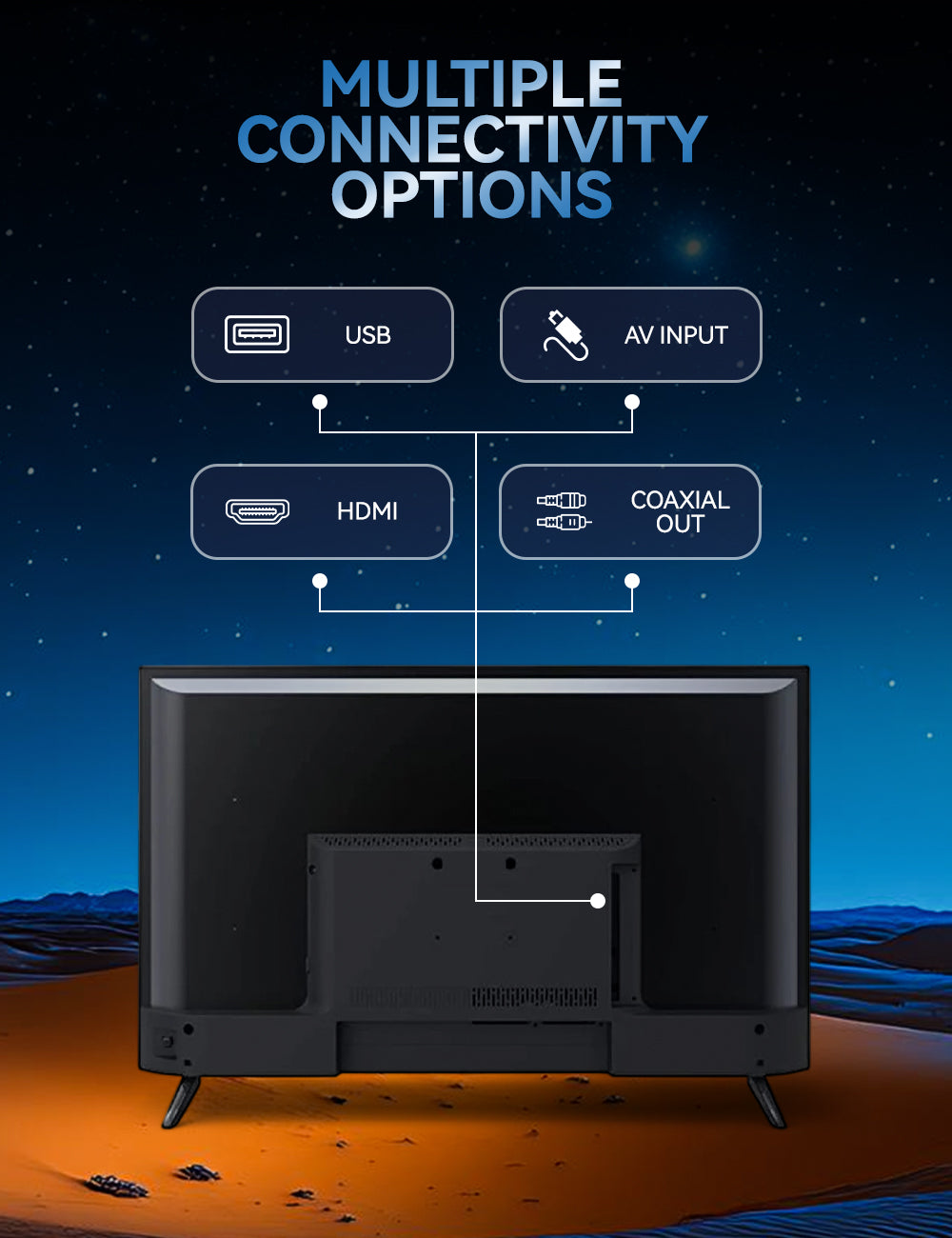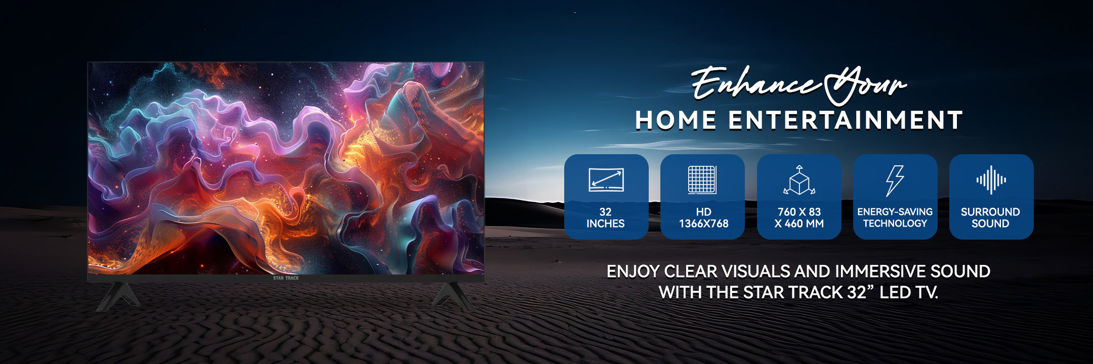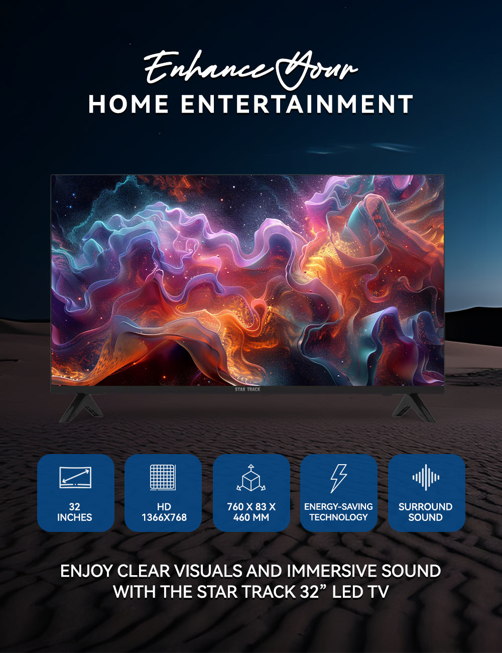 Experience stunning picture quality with the Star Track 32β HD LED TV. Featuring a bezel-less design, high brightness, fast response time, and surround sound, this ultra-slim TV is built for immersive entertainment. With multiple connectivity options, including HDMI, USB, and AV input, enjoy seamless access to your favorite movies, shows, and games.