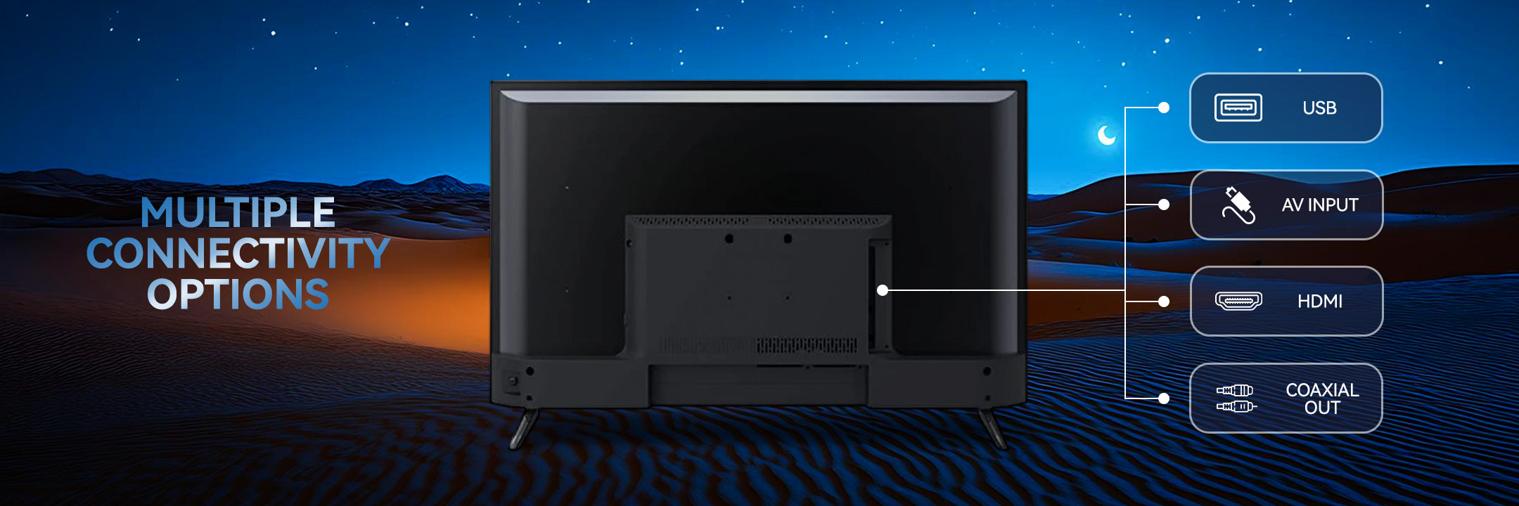 - Ports: HDMI x2, USB x2, AV Input x1, Coaxial Out x1