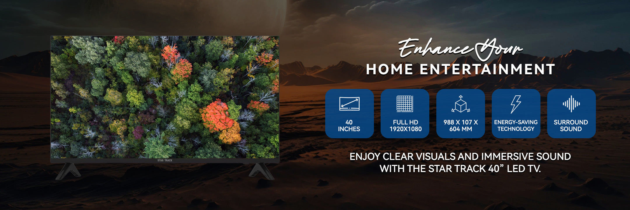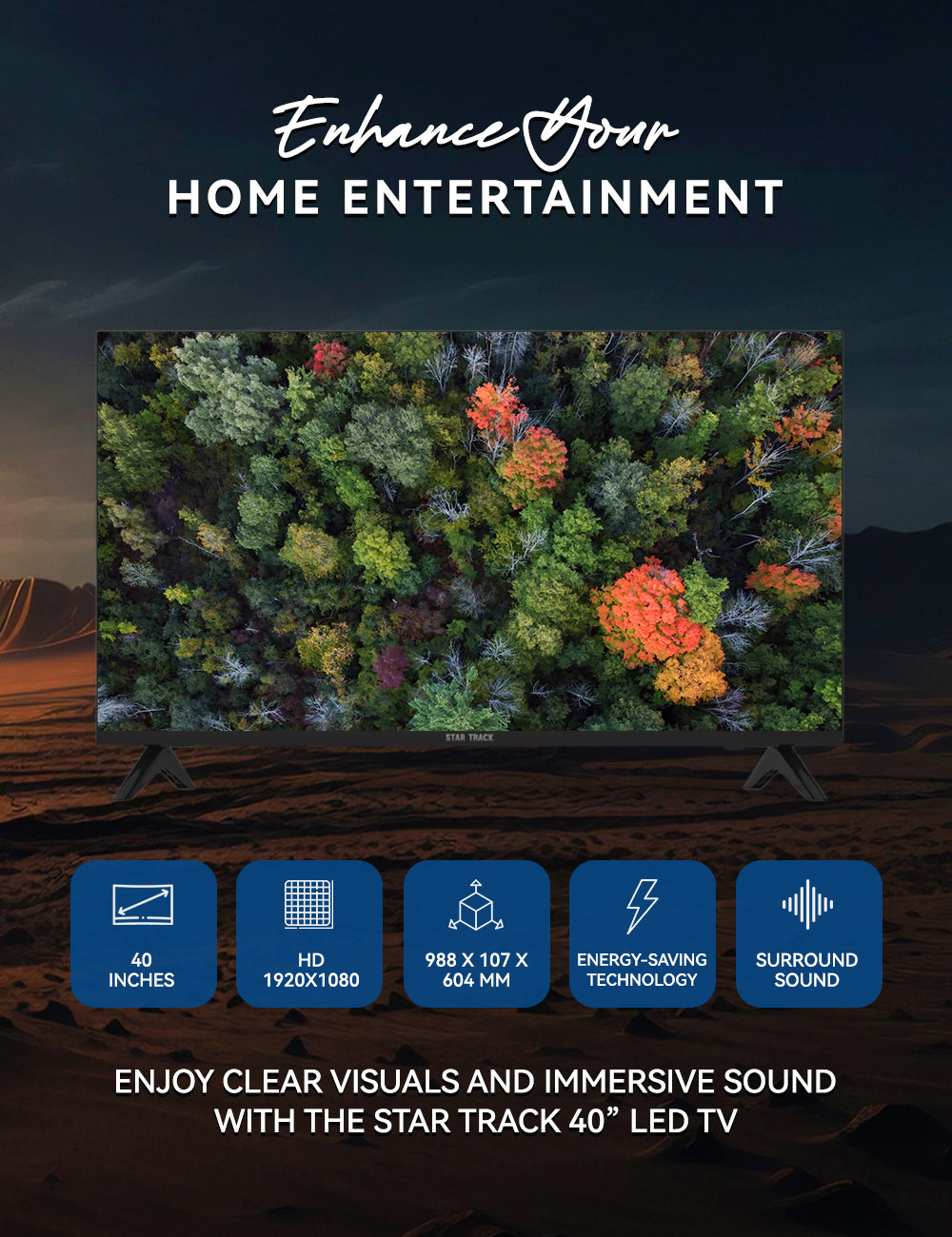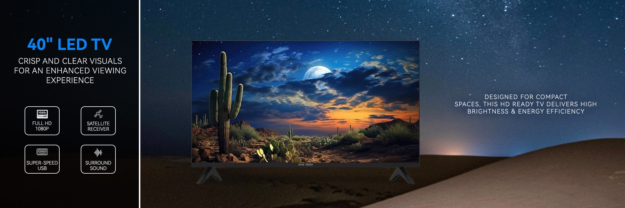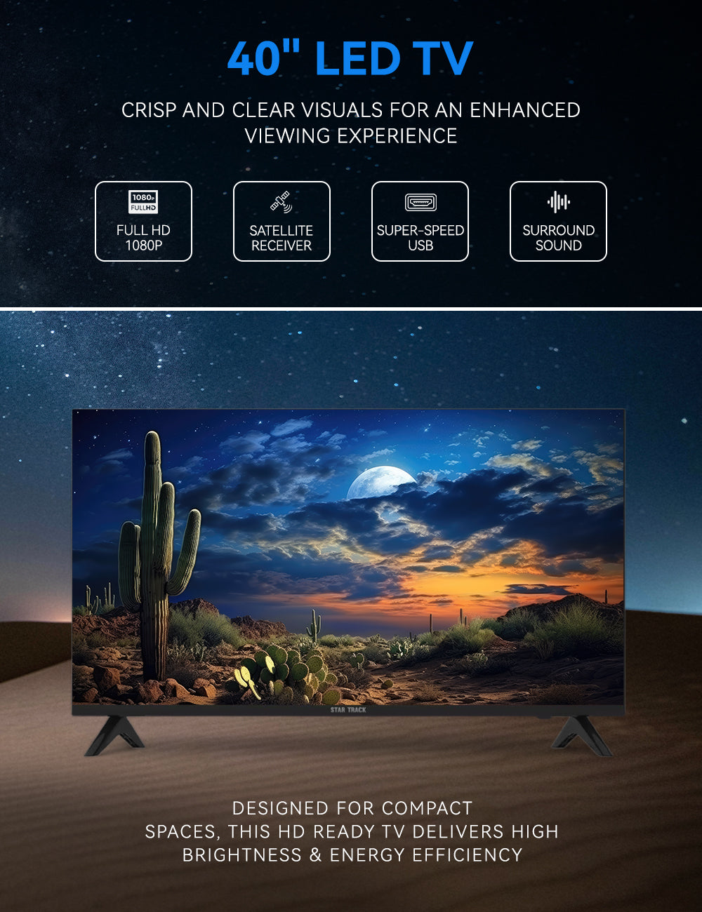 Experience stunning picture quality with the Star Track 40β Full HD LED TV. Featuring a classic bezel design, high brightness, fast response time, and surround sound, this ultra-slim TV is built for immersive entertainment. With multiple connectivity options, including HDMI, USB, and AV input, enjoy seamless access to your favorite movies, shows, and games.