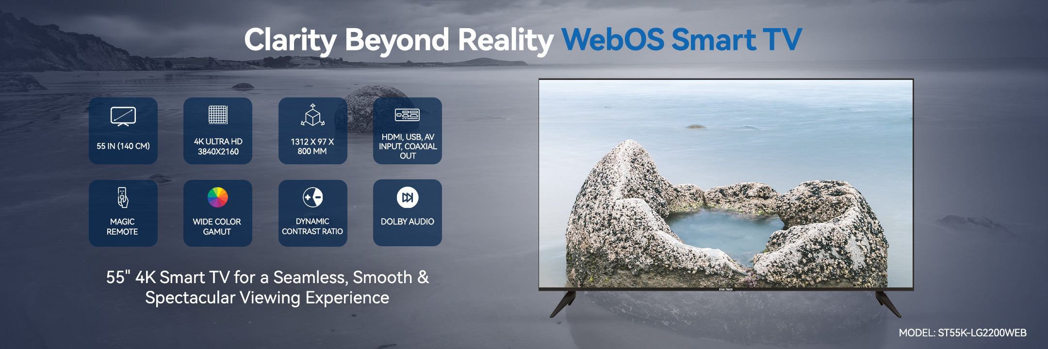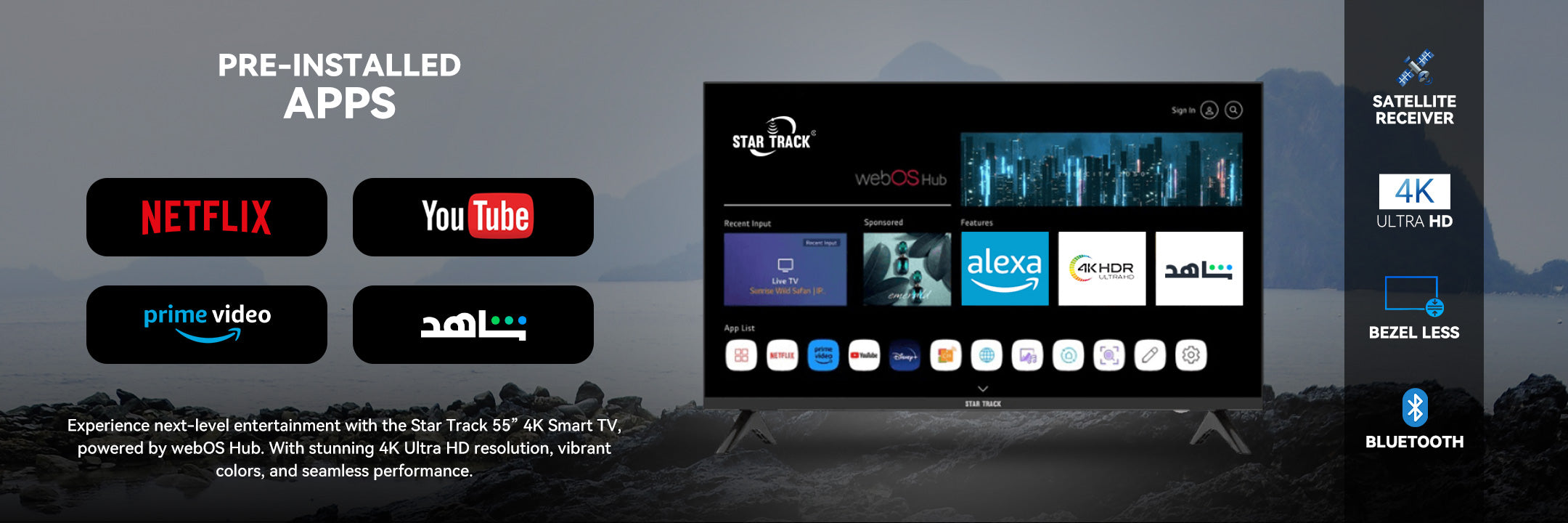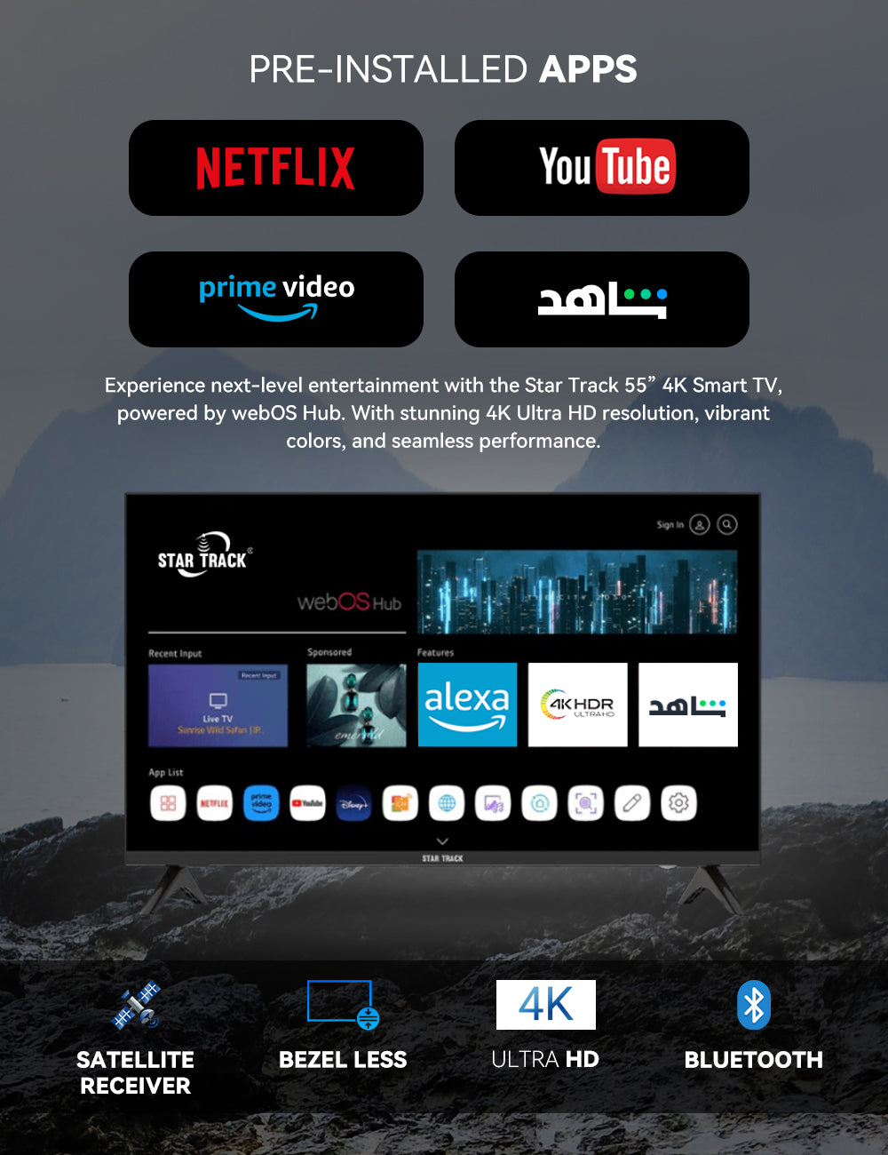Experience next-level entertainment with the Star Track 55” 4K Smart TV, powered by webOS Hub. With stunning 4K Ultra HD resolution, vibrant colors, and seamless performance, enjoy built-in streaming apps like Netflix, YouTube, Prime Video, Shahid, and more. The powerful processor, Magic Remote, and Bluetooth connectivity ensure a smooth and immersive experience.