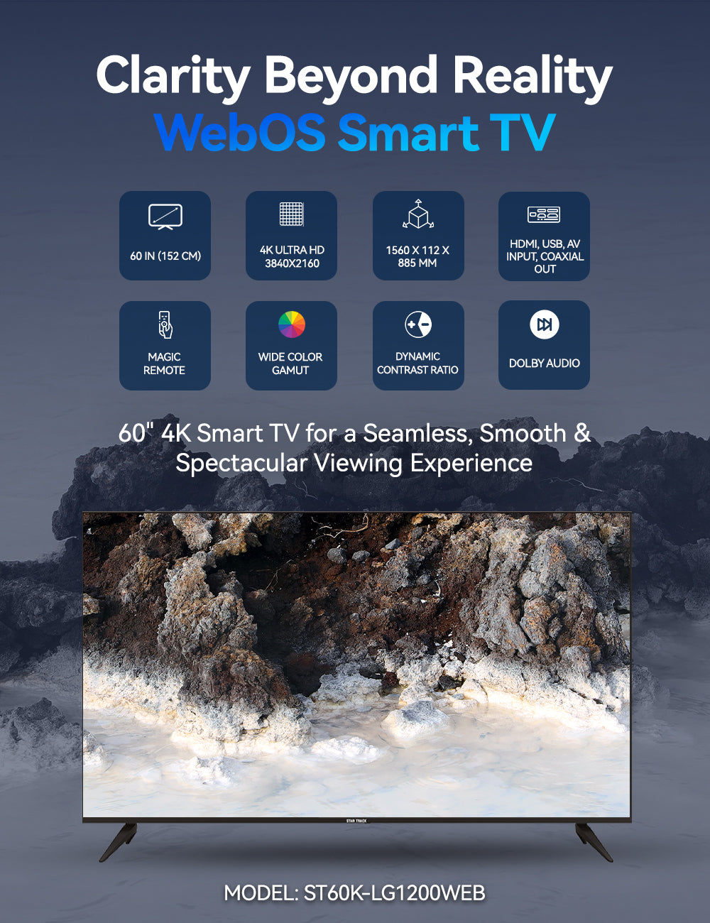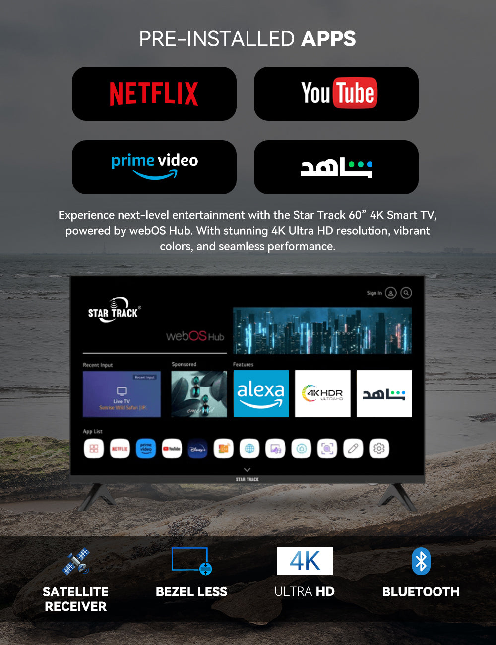 🎬 Upgrade your entertainment with the Star Track 60” 4K Smart TV! Order now and bring the future of smart viewing home! 🚀