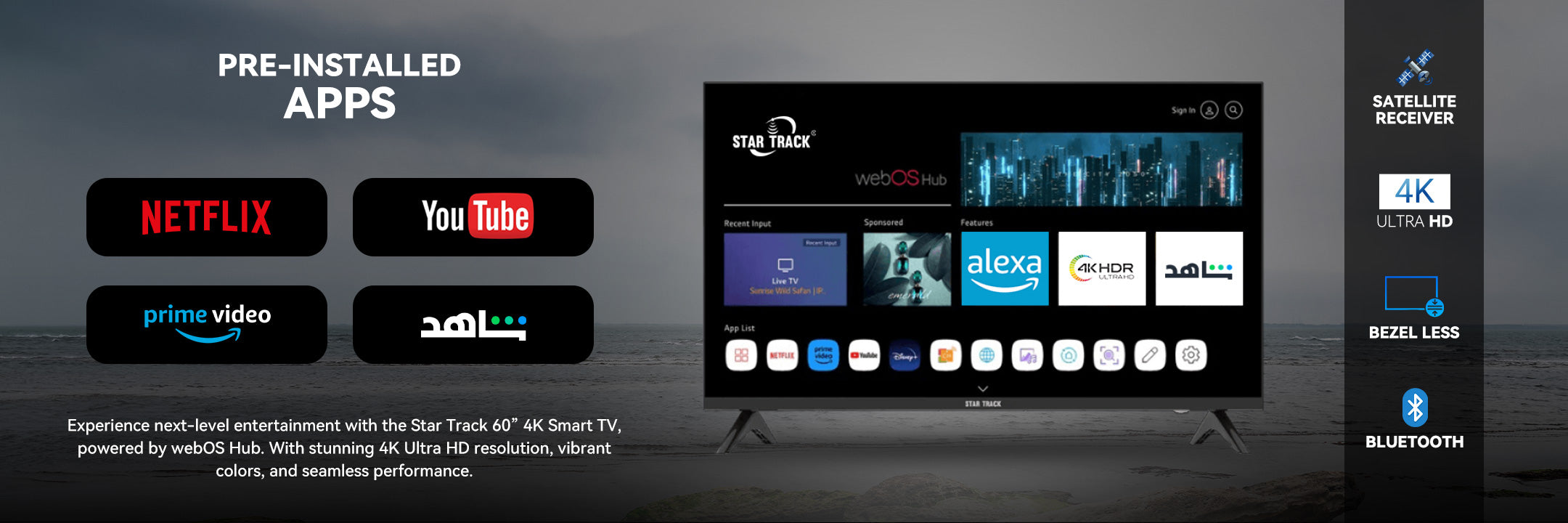 Experience next-level entertainment with the Star Track 60” 4K Smart TV, powered by webOS Hub. With stunning 4K Ultra HD resolution, vibrant colors, and seamless performance, enjoy built-in streaming apps like Netflix, YouTube, Prime Video, Shahid, and more. The powerful processor, Magic Remote, and Bluetooth connectivity ensure a smooth and immersive experience.