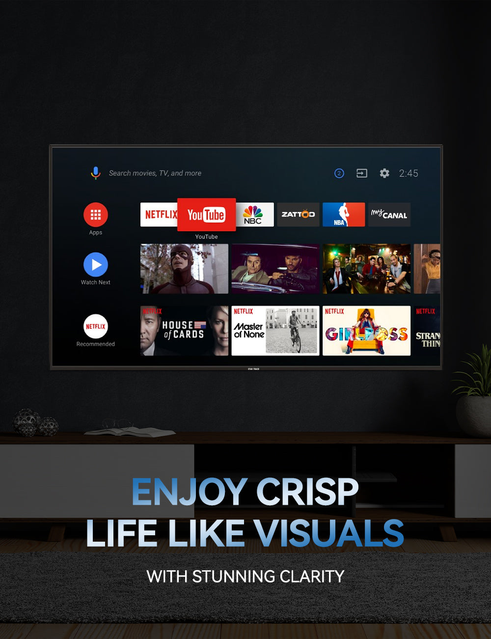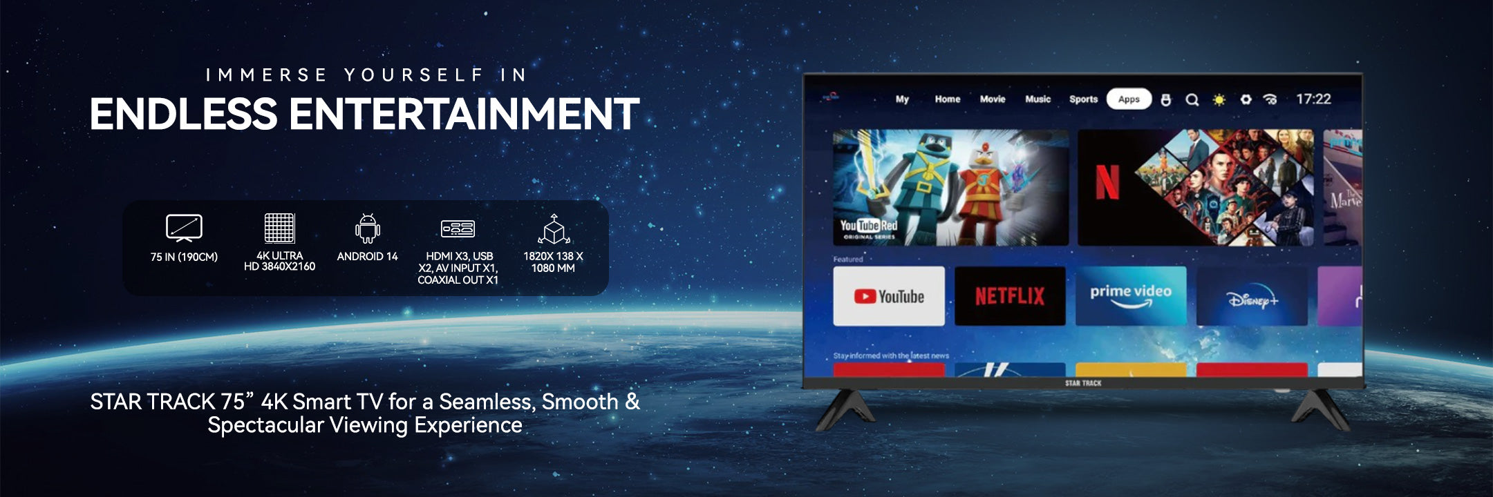 Experience stunning 4K Ultra HD clarity with the STAR TRACK 75” Smart TV, designed for next-level entertainment. Powered by Android 14, enjoy seamless access to Netflix, YouTube, Prime Video, Shahid, Spotify, and more. With Miracast, wirelessly mirror your phone for an immersive viewing experience.