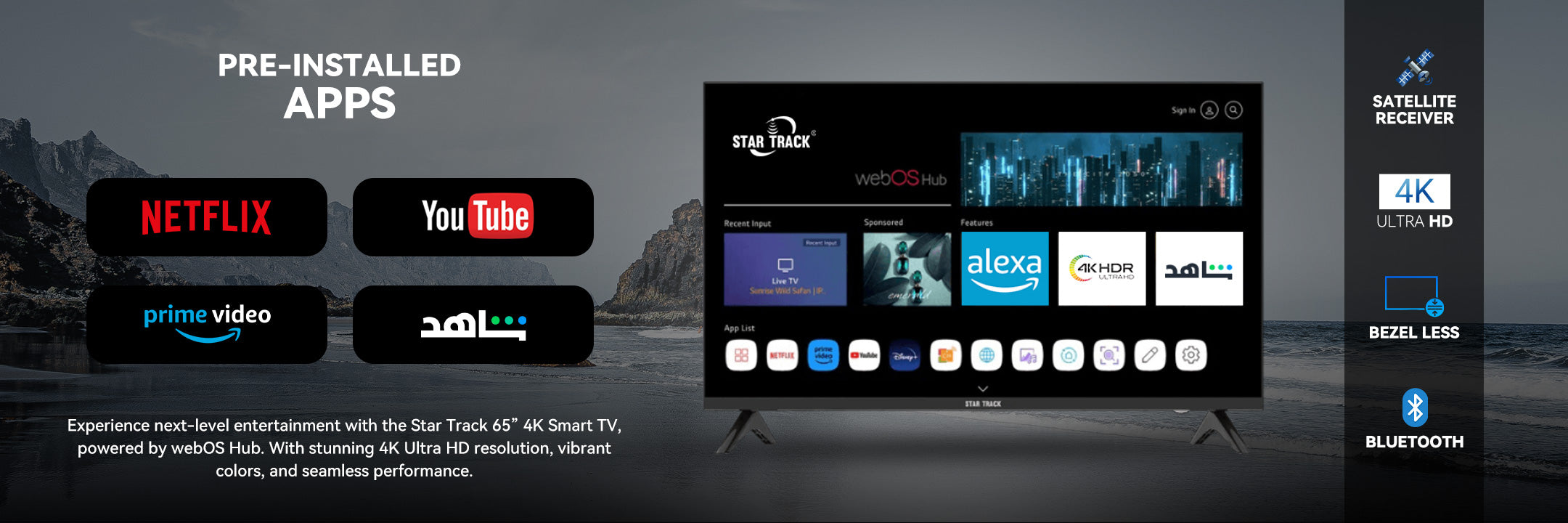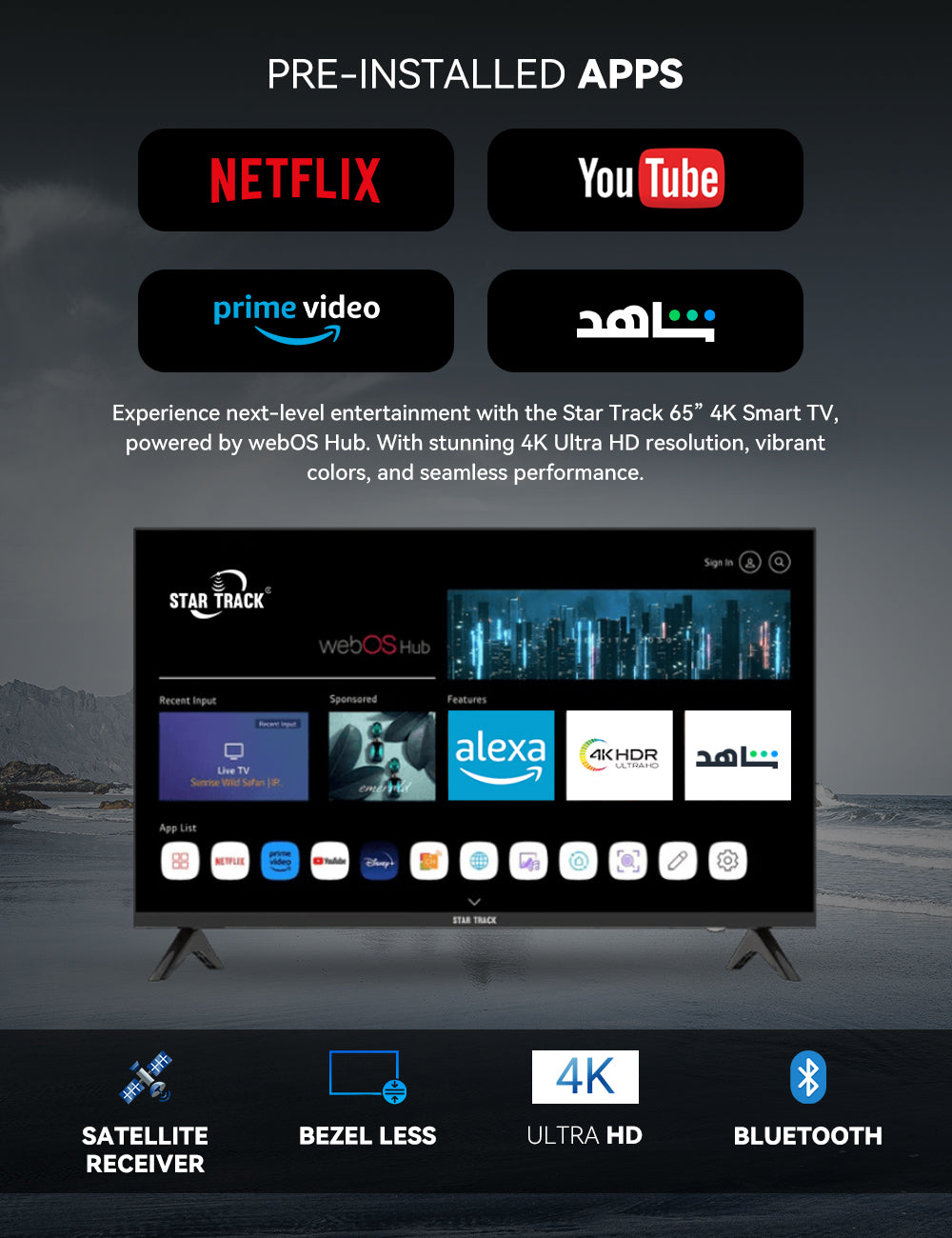 Experience next-level entertainment with the Star Track 65” 4K Smart TV, powered by webOS Hub. With stunning 4K Ultra HD resolution, vibrant colors, and seamless performance, enjoy built-in streaming apps like Netflix, YouTube, Prime Video, Shahid, and more. The powerful processor, Magic Remote, and Bluetooth connectivity ensure a smooth and immersive experience.