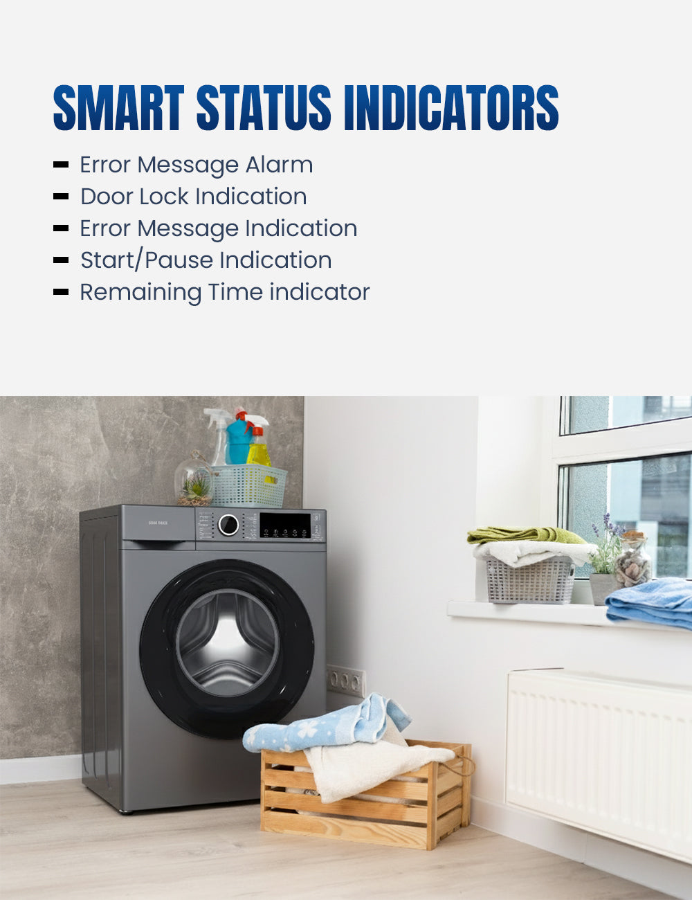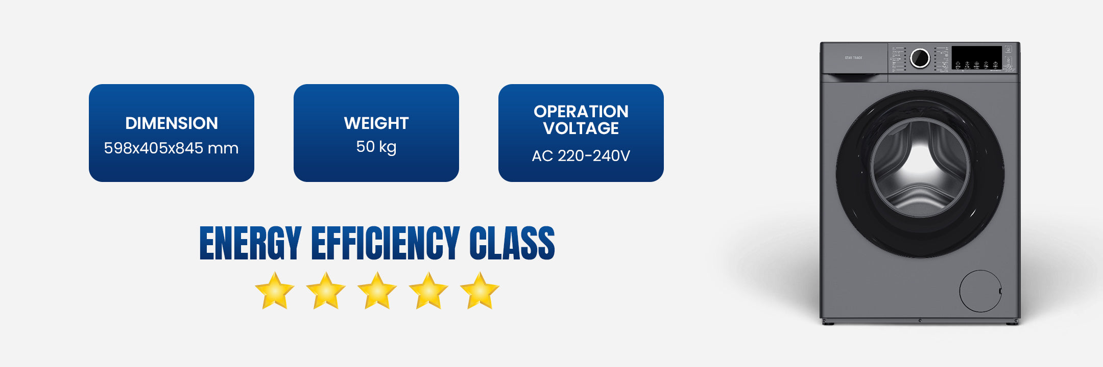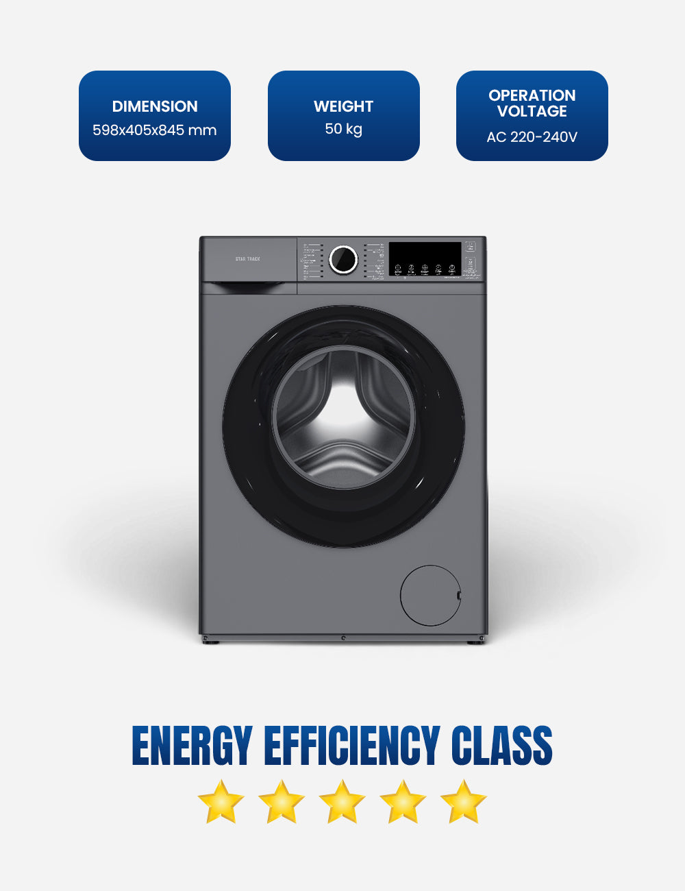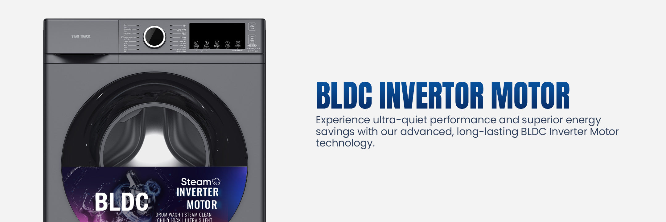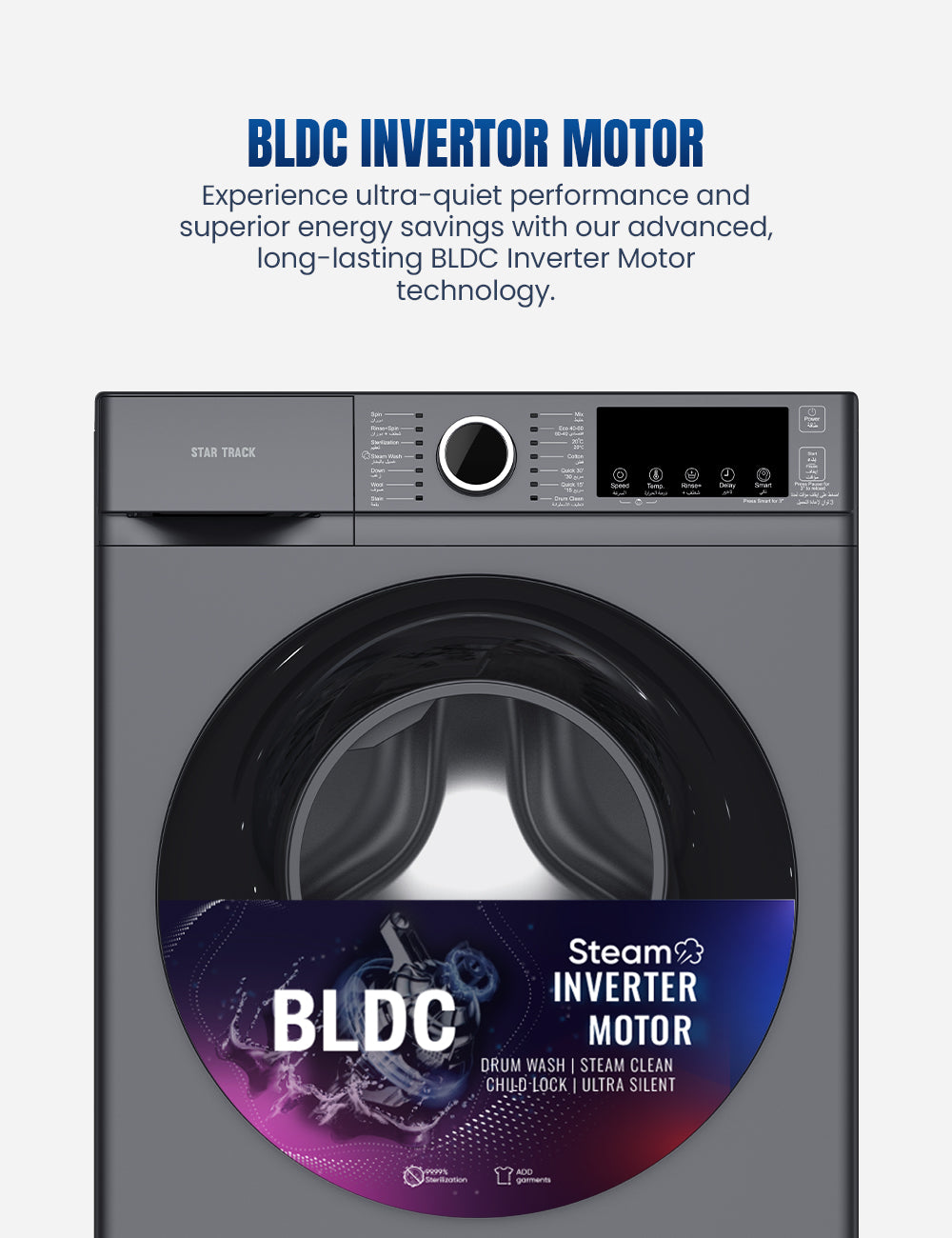 The STAR TRACK 6KG Front Load Automatic Washer is engineered to deliver exceptional cleaning power while fitting seamlessly into smaller spaces. Built around a high-performance BLDC Inverter Motor, this machine provides whisper-quiet operation, outstanding energy savings, and long-lasting durability, earning a top-tier ESMA 5-Star Energy Efficiency Rating (UAE). Manage laundry effortlessly with 14 specialized programs and advanced intelligent controls.